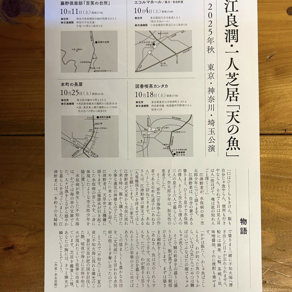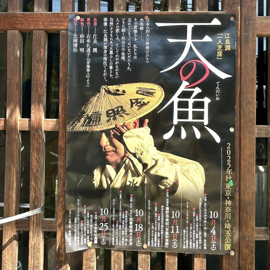 「天の魚」はの原作は石牟礼道子氏の名著『苦海浄土』で「公害の原点」といわれる水俣病の悲惨と人間の尊厳を描き読者の心に深く訴えかけます。俳優・江良潤さんは、いまに続くその不条理の世界を一人でも多くの人々に伝えたいと公演活動を続けていらっしゃいます。