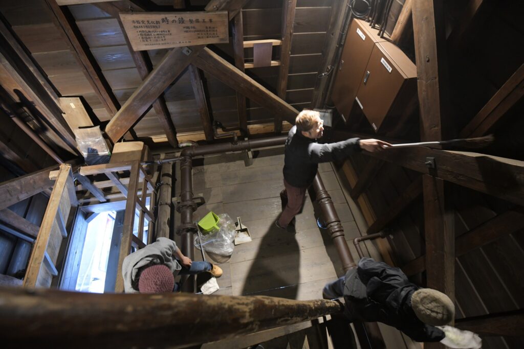 川越蔵の会では、川越市文化財保護と連携し、年末恒例の「時の鐘」内の掃除を会員たちによって行いました。一年に一度の掃除ですが、埃が気になるくらいでそれほど汚れていません。時の鐘は内側から綺麗になって、川越のシンボルとしてさらに輝いています。