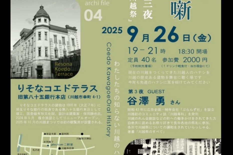 現在の川越をつくってきた川越人のハナシを川越の建物を舞台に聴く『川越夜噺』第三夜… 続きを読む »『川越夜噺』第三夜